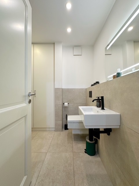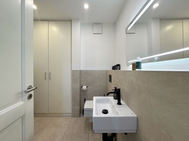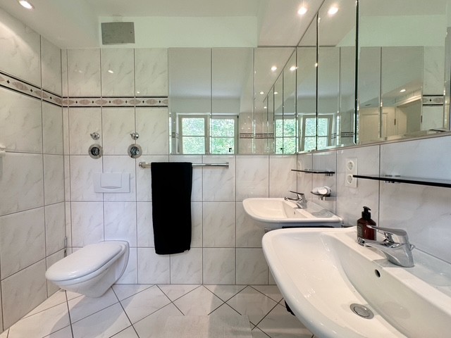 schlicht weiß gefliest und das Gästebad ist großformatig gefliest in anthrazit, gepaart mit weißer