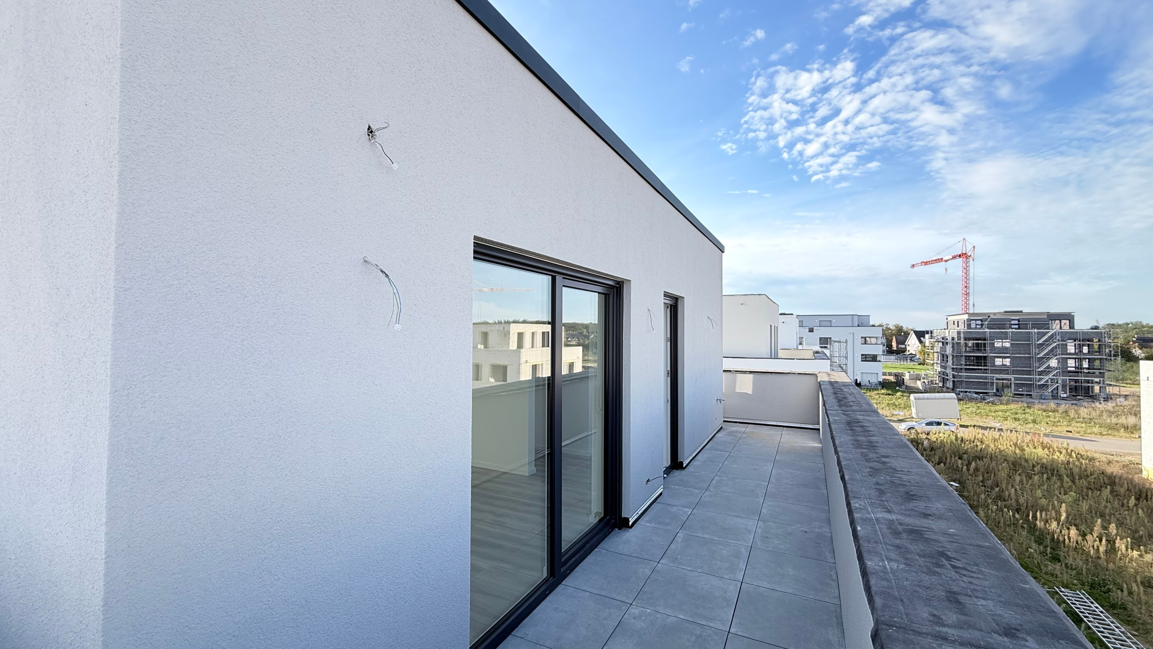 Die umlaufende Terrasse und der Balkon bieten ideale Bedingungen zum Entspannen, Sonnen oder geselligen Beisammensein im Freien – mit Blick auf das junge, grüne Neubaugebiet.
