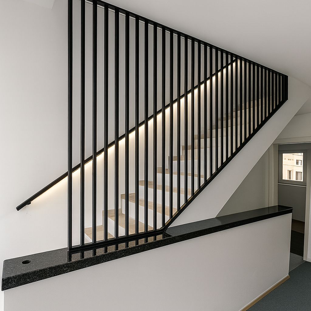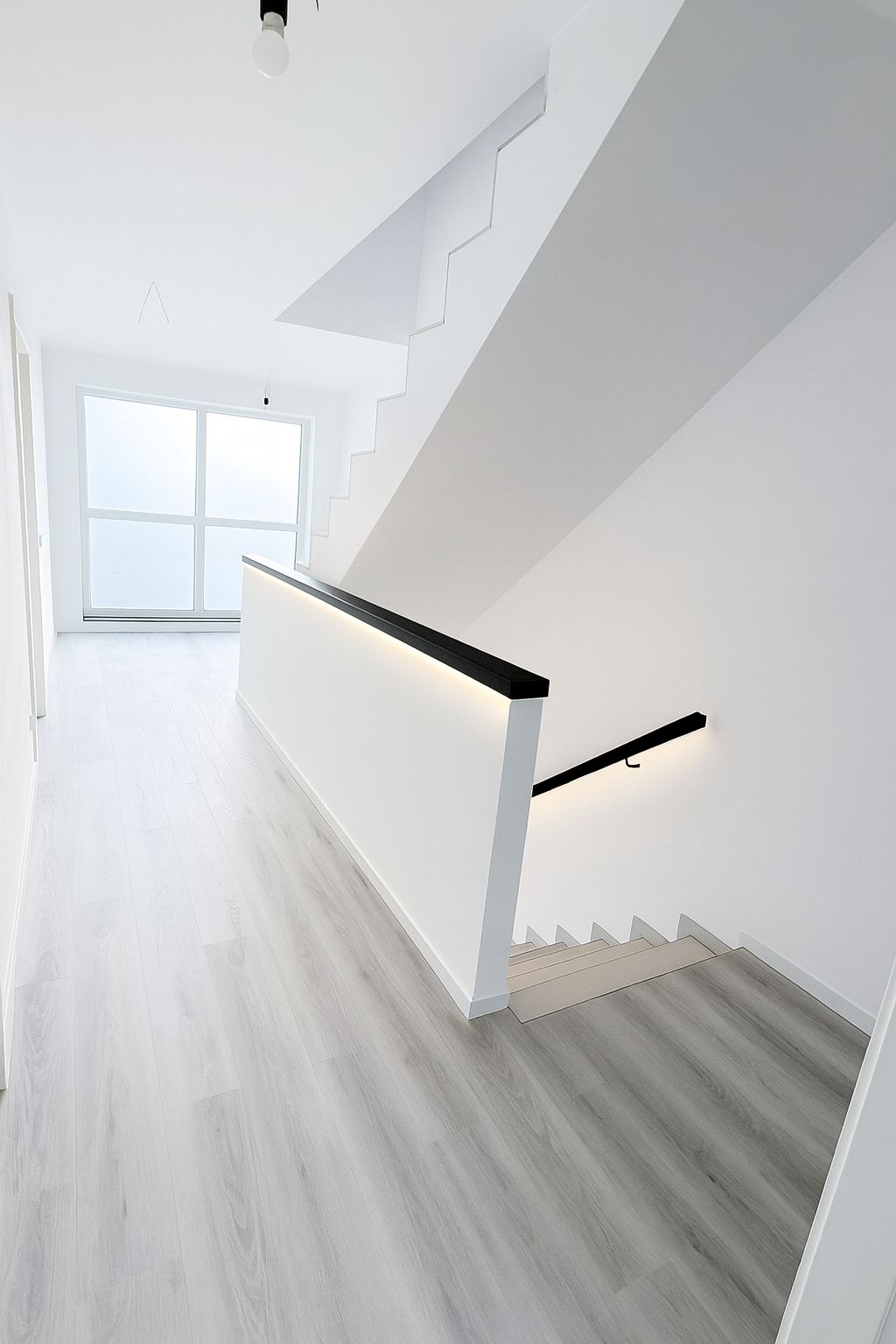 Über eine architektonisch gestaltete Treppe mit integriertem LED-Handlauf gelangt man in das Obergeschoss, wo sich die private Rückzugsebene mit drei Schlafzimmern befindet – darunter ein großzügiges Master-Bedroom mit Bad en Suite.