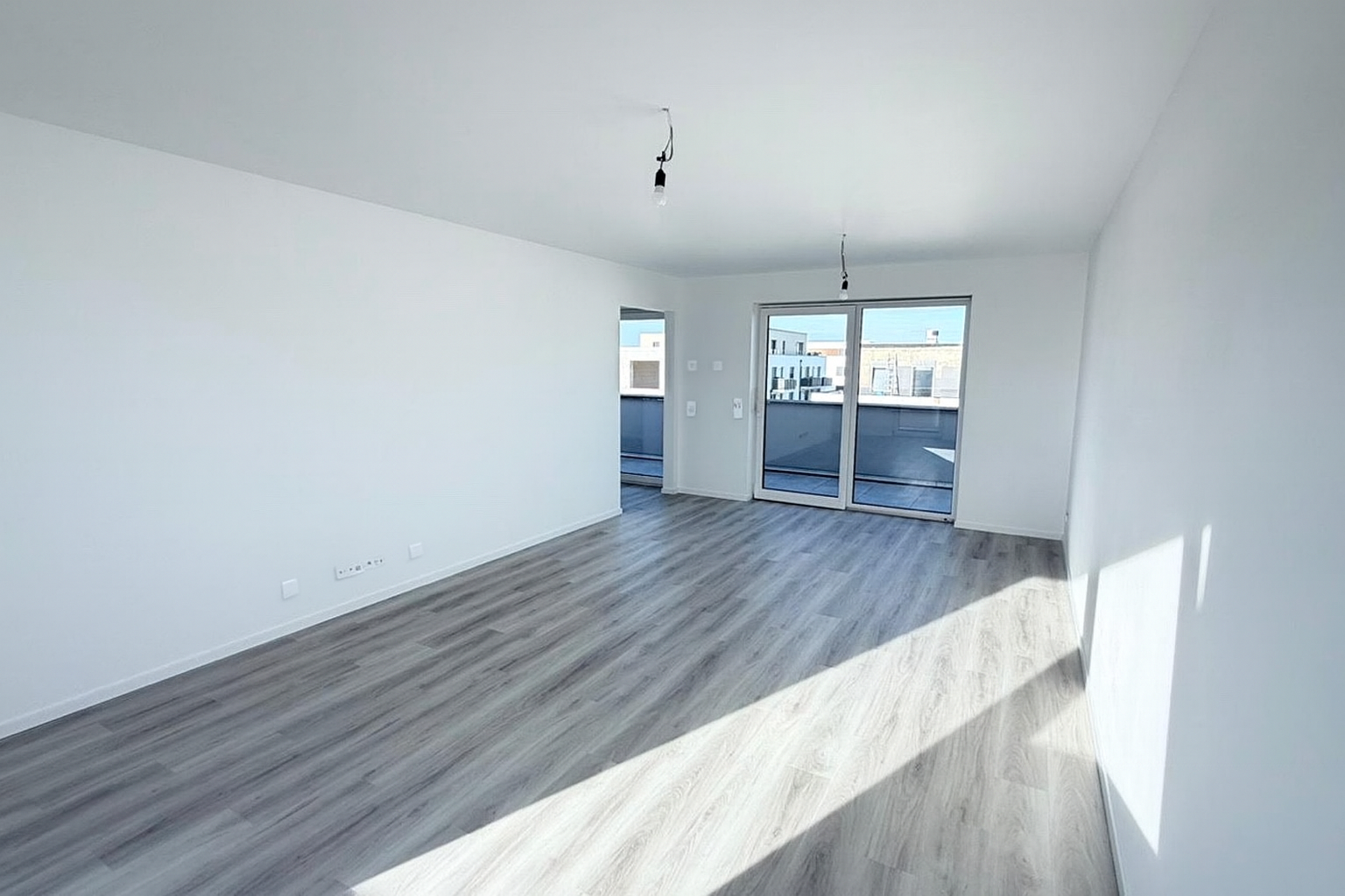 Die umlaufende Terrasse und der Balkon bieten ideale Bedingungen zum Entspannen, Sonnen oder geselligen Beisammensein im Freien – mit Blick auf das junge, grüne Neubaugebiet.